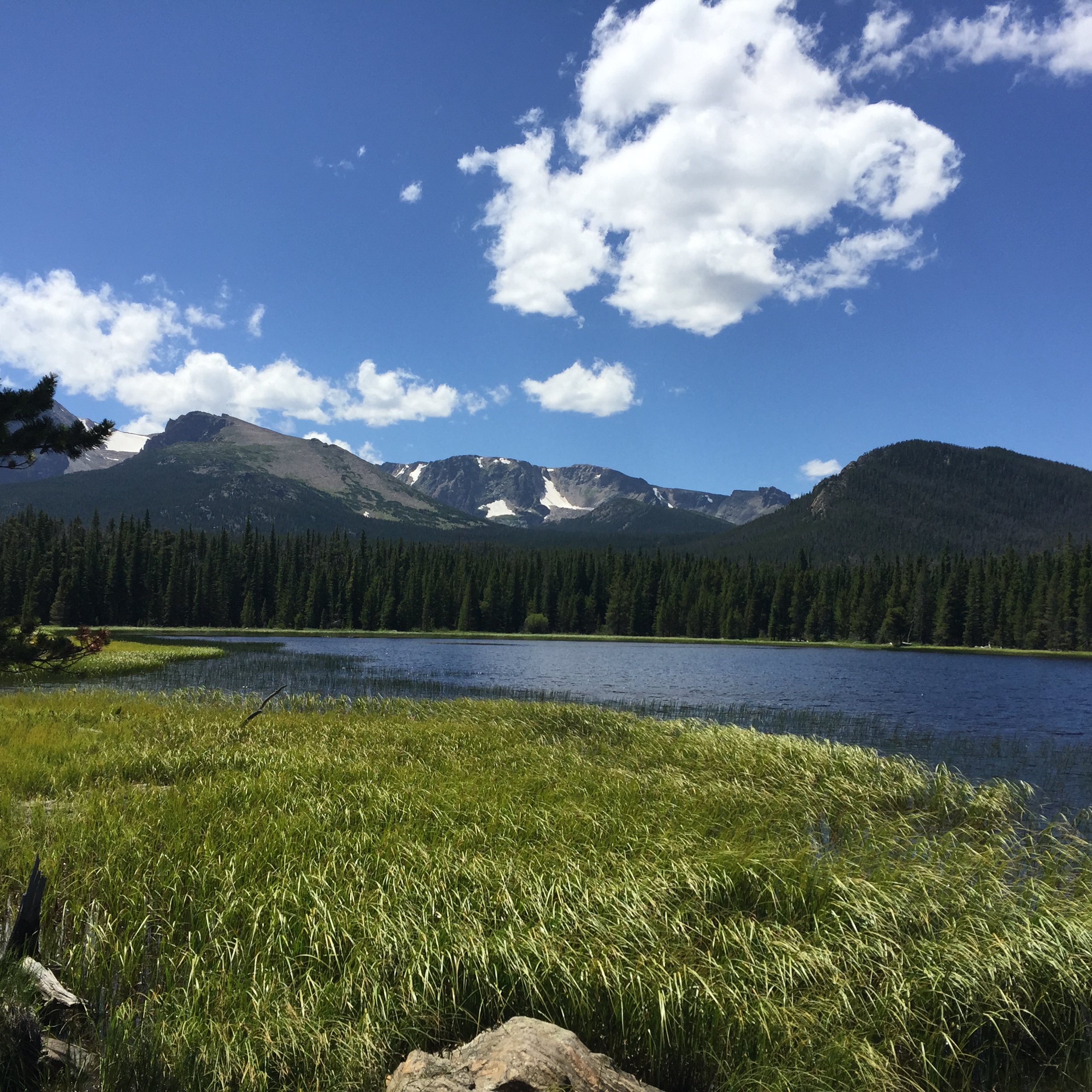 From the junction we followed the trail through forest away from the mountains. Once we arrived at the lake we took a nice rest to let Cecy have some time out of her carrier (it was a pretty warm day), eat a snack and take in the views. I think the best view is when you walk half way around the lake and turn back to see Flattop Mountain in the distance.We hiked back to our starting point at Bear Lake – a mostly uphill return journey. As an alternative, you could continue for 1.3 miles to end up at Bierstadt Trailhead and take the shuttle back to Bear Lake parking lot. I would think this route would be easier, but I’ll have to try it out to confirm.