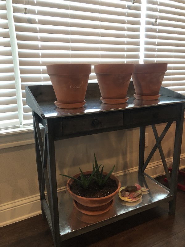 This month we put together a fresh herb garden under a window in our living room. Picking out the stand, buying the pots, and planting the seeds was a fun project that involved our whole family. We planted basil, rosemary and thyme seeds along with an aloe plant. For added fun, I put out a colorful fish plate that the girls painted as a spot to keep their growing rock collection.