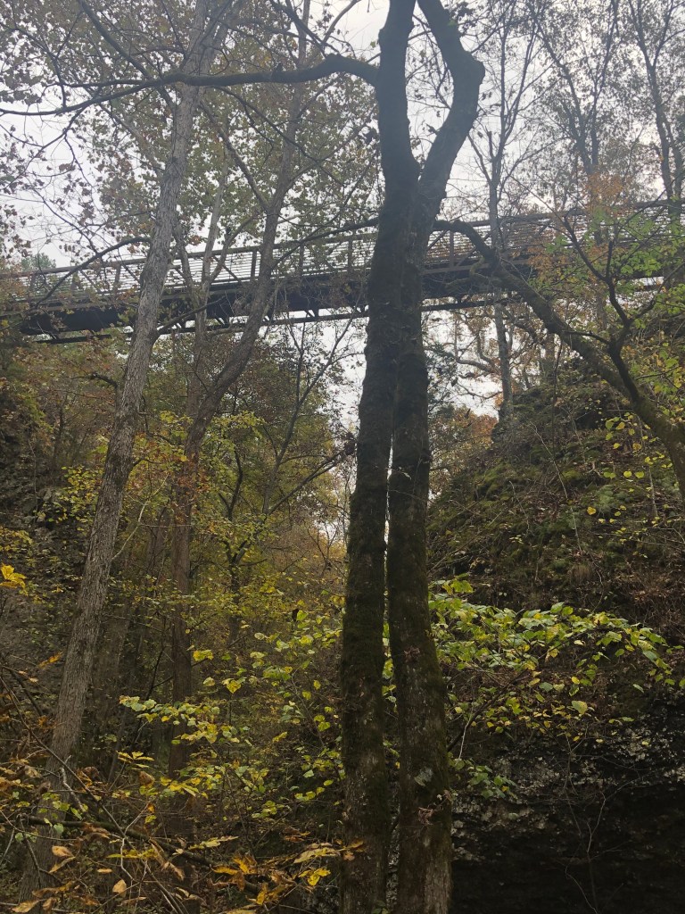 View from above waterfallWaterfall view from below fallsBridge crosses over the waterfallAutumn color in the forest.There is a small fishing area and a picnic table along the trail.The girls love playing with ‘gross’ things. Photo credit – my amazing sister.