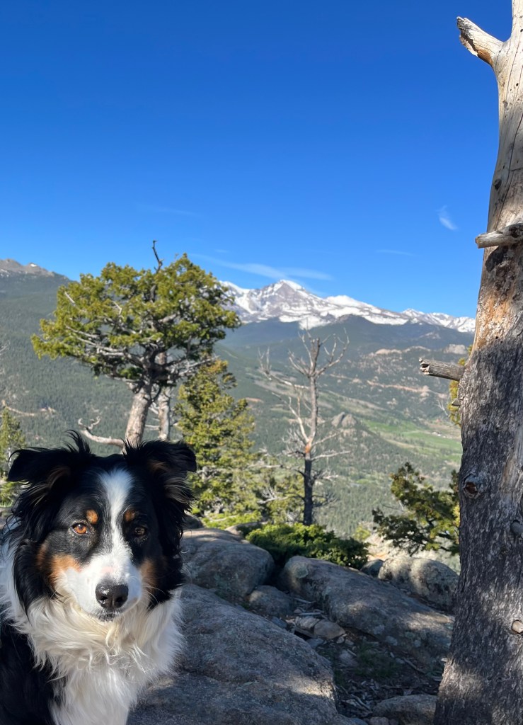 I’m excited to share our latest adventure in Estes Park, Colorado. We brought our three-year-old Australian Shepard, Sky. I was nervous about how well our active pup would do on the long drive from Arkansas to Colorado, but after talking to her vet and the owner of her doggie daycare, we decided to bring Sky along with us.