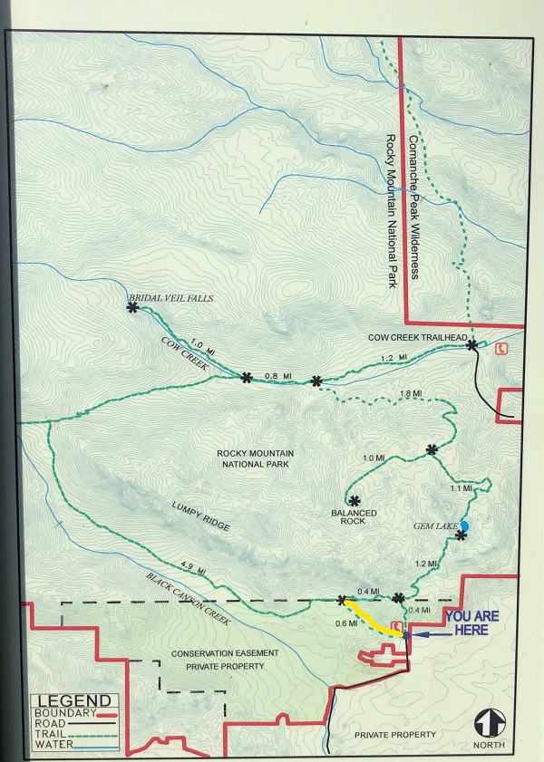 Here is a map of the Lumpy Ridge trails. Lumpy Ridge trailhead begins at 7,840 ft of elevation, I believe that’s the lowest trailhead elevation in Rocky Mountain National Park.
