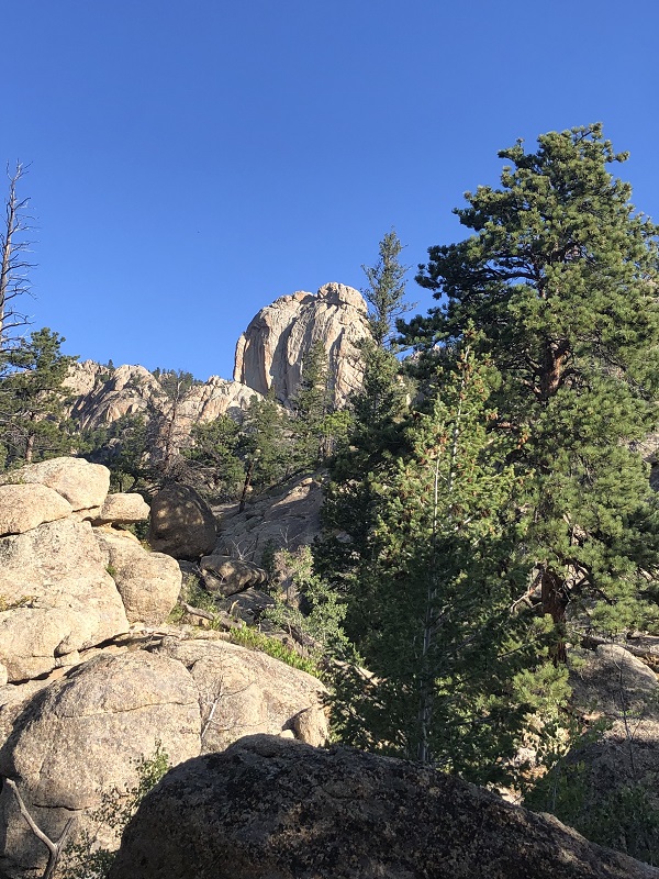 We continued our hike, but soon the trail divided. The left leads to climber access trails for Batman Rock as well as The Book, The Pear, and Sundance Buttress. We were surprised to see that the trail continues all the way to Lawn Lake (9 miles).